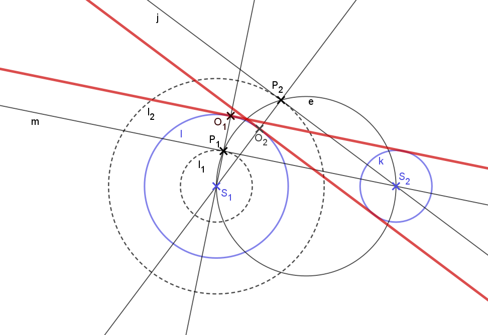 Řešení (červeně): Obě zadané kružnice zmenšíme o poloměr menší z nich (r_2): z kružnice l tedy vznikne kružnice l_1, z kružnice k zbude jen bod (S_2). Víme, že tečna na kružnici a přímka, která spojuje střed a tento tečný bod, vždy svírají úhel 90°, pomocí Thaletovy kružnice tak nalezneme bod dotyku tečny (P_1). Spojením tohoto bodu (P_1) a středu S_2 mi vznikne přímka m. Rovnoběžka na tuto přímku, posunutá o poloměr menší kružnice r_2 ve směru na ní kolmém od středu S_1, je řešením úlohy. Řešením je tak dvojice přímek (v obrázku je pro zjednodušení zakreslena jen jedna ze dvou tečen). K nalezení druhé dvojice řešení aplikujeme stejný postup, jen na začátku kružnici l zvětšíme o poloměr r_2 (opět je do obrázku zanesena jen jedna ze dvou vzniknuvších přímek).